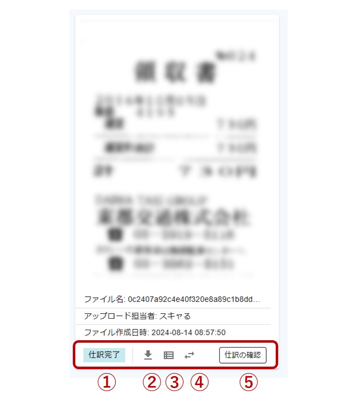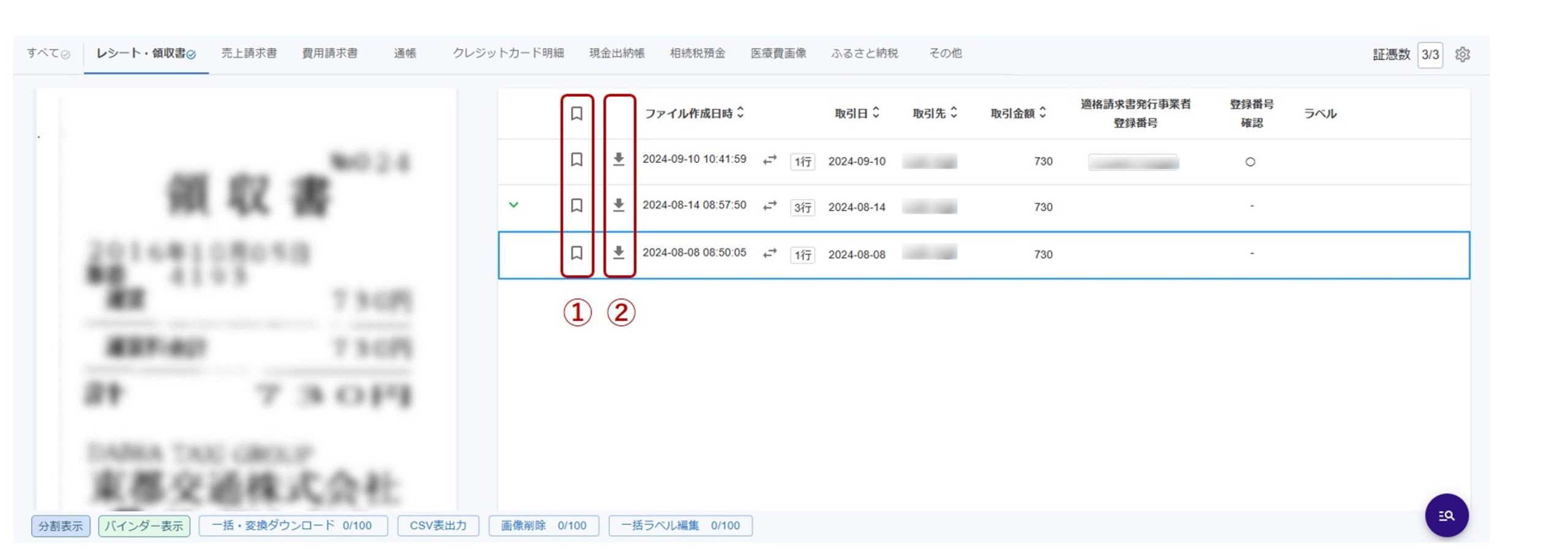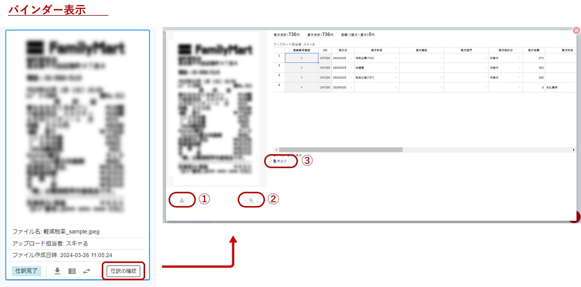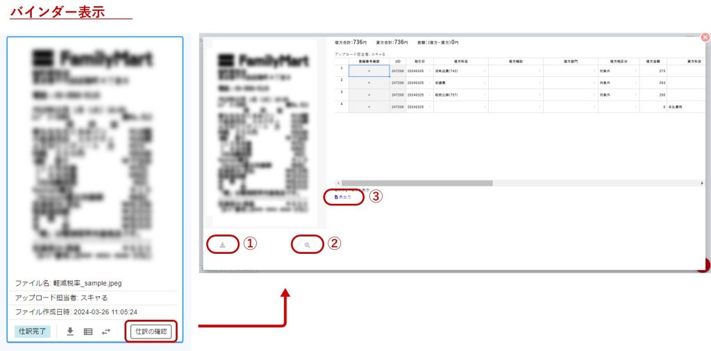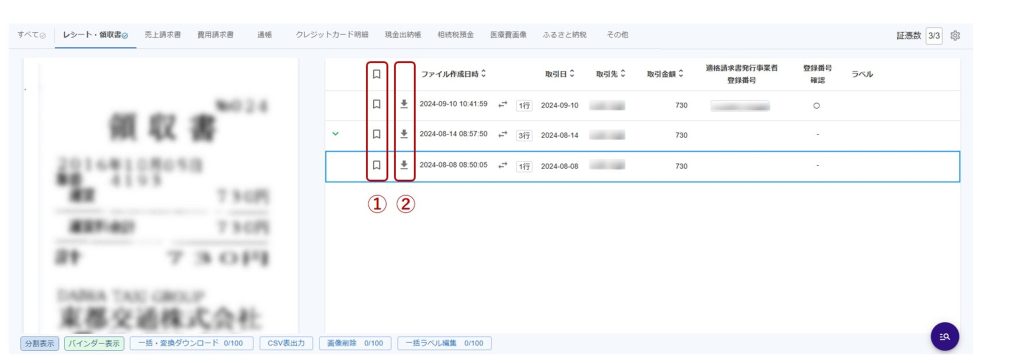 ダウンロードアイコン(②)をクリックすると証憑画像をダウンロードできます。