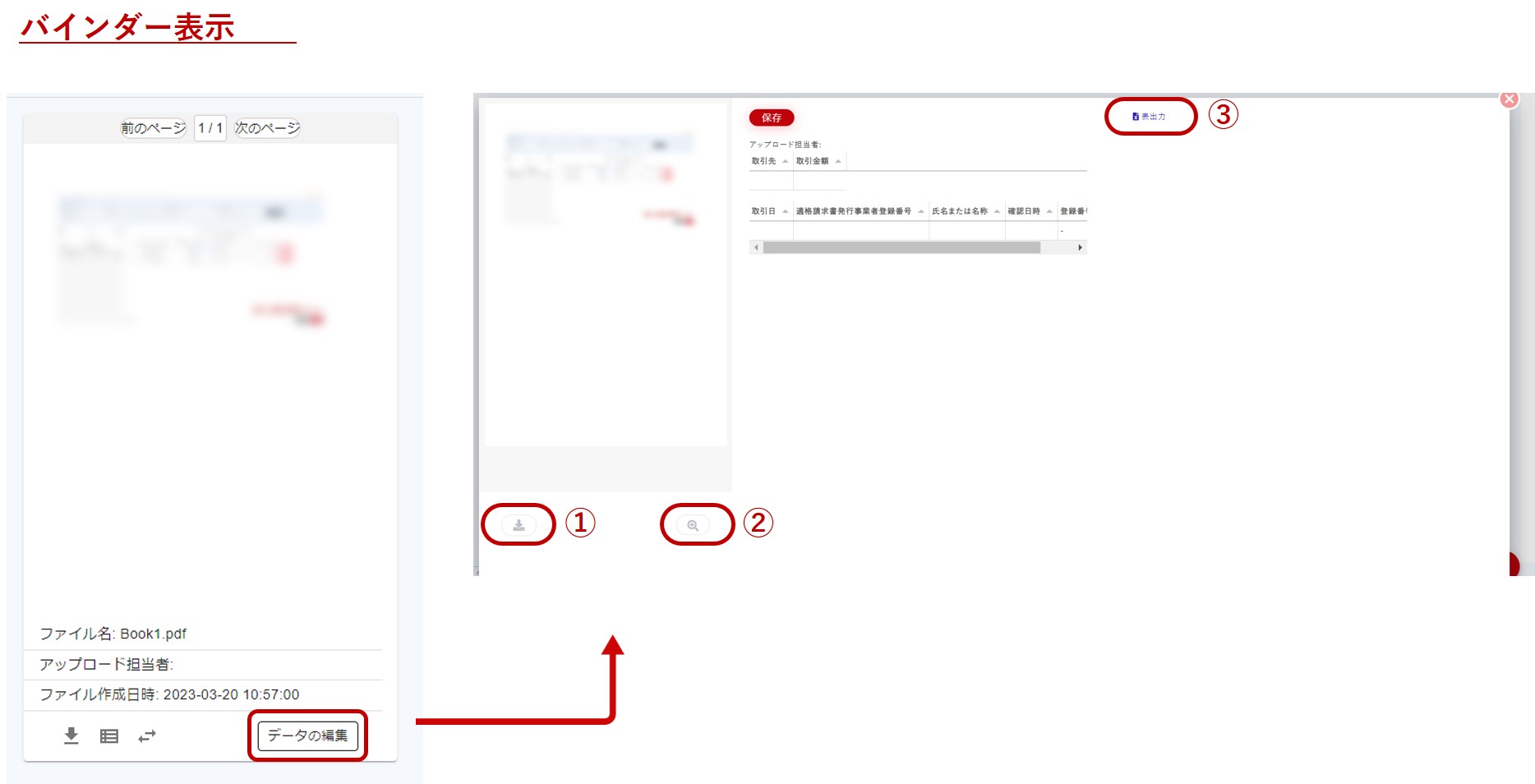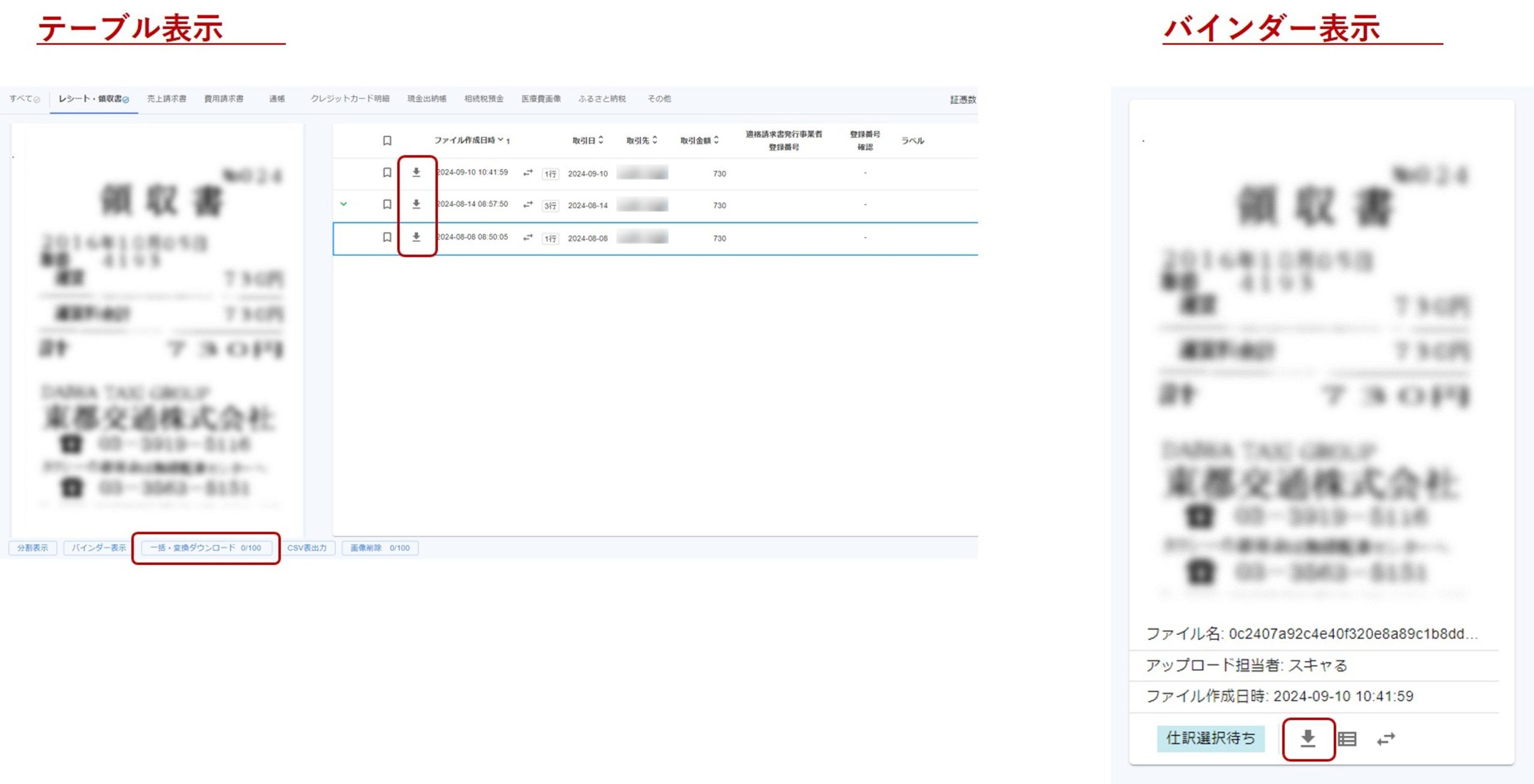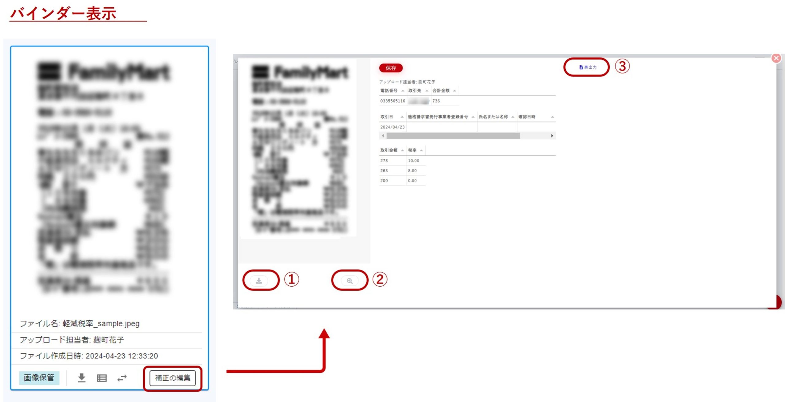 ダウンロードアイコン(②)をクリックすると証憑画像をダウンロードできます。
