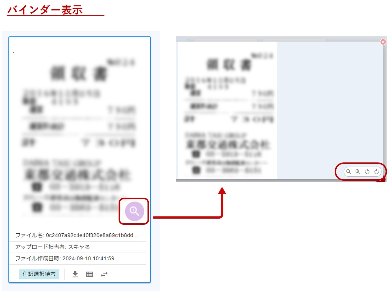 虫眼鏡アイコンをクリックし、画像を拡大・縮小・左回転・右回転して表示します。