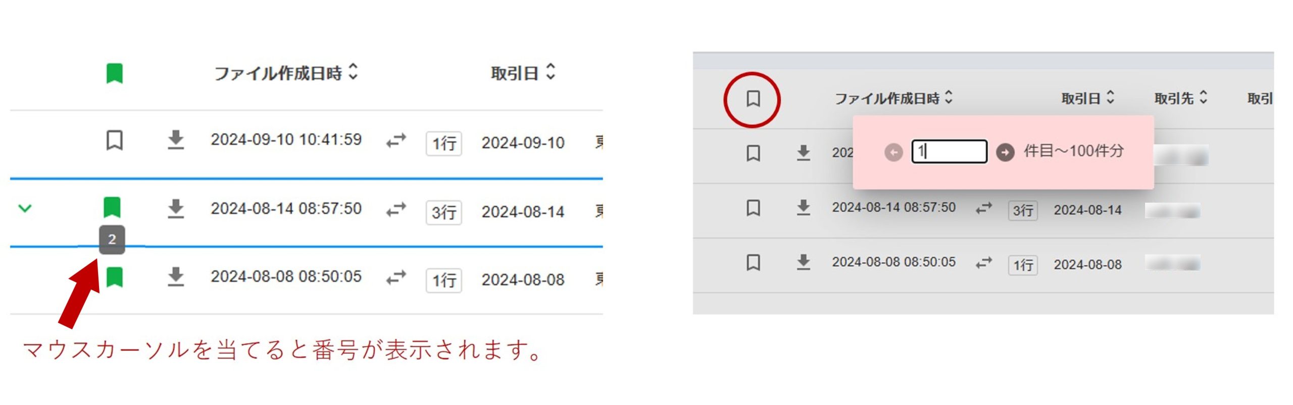「何件目から開始すればいいか分からない」という場合は、選択アイコンにマウスカーソルを合わせると、その項目の番号(行番号)が表示されます。