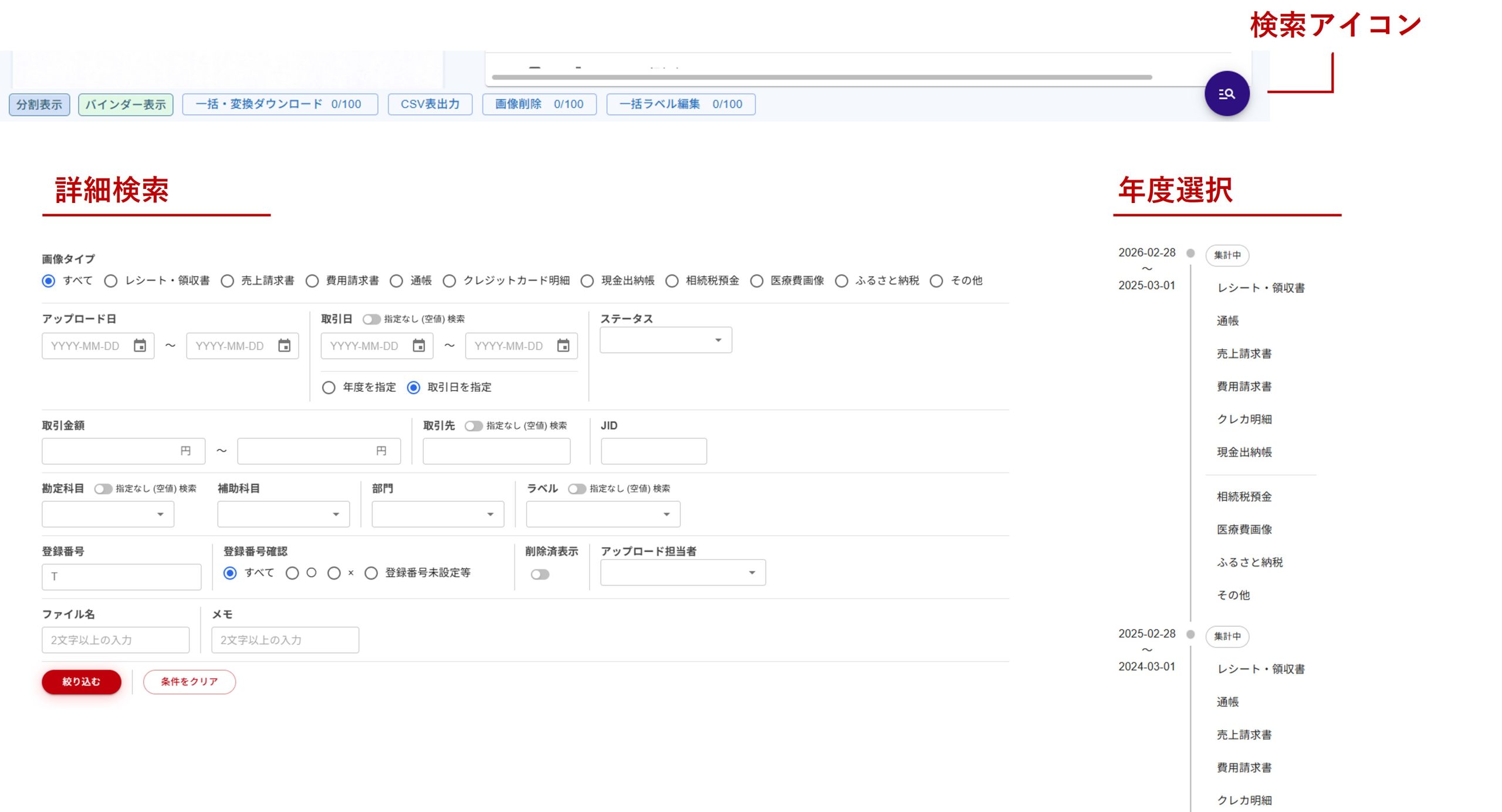 画面右下の検索アイコンをクリックし、詳細検索または年度選択をクリックします。